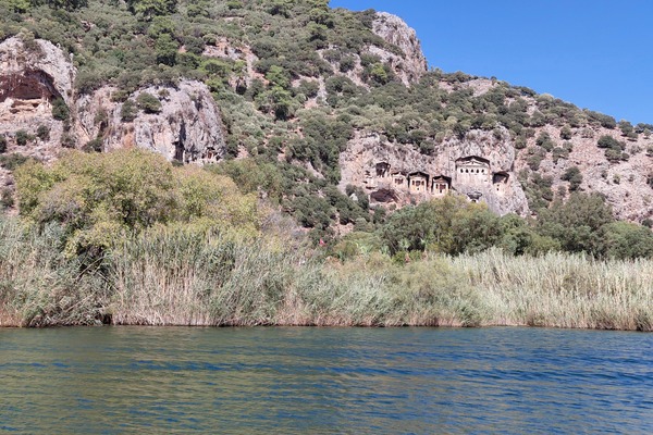 On Monday, and as planned, we took the day off for a very full day trip in flat bottomed boats up the Koyceguz River to Dalyan. This started with an opportunity to get close up and personal with some beautiful cave and arch formations along the coast before entering the river at Turtle Beach, which is an important egg laying site for Loggerhead turtles, not that we saw any! Beautiful, nonetheless.